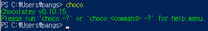 그 다음 `choco -?` 명령이나 `choco` 명령어로 설치된 것을 확인 할 수 있다.