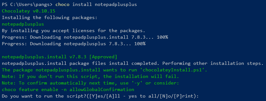 이러면 설치 후 작업을 위해(path설정 등) script를 실행하라고 하는 경우가 많다. 매번 실행 할 때는 설명에 있듯이 -y 옵션을 붙여주면 물어보지 않고 바로 실행해준다. notepad++도 자동으로 path에 등록되고 시작메뉴에 등록되었다.