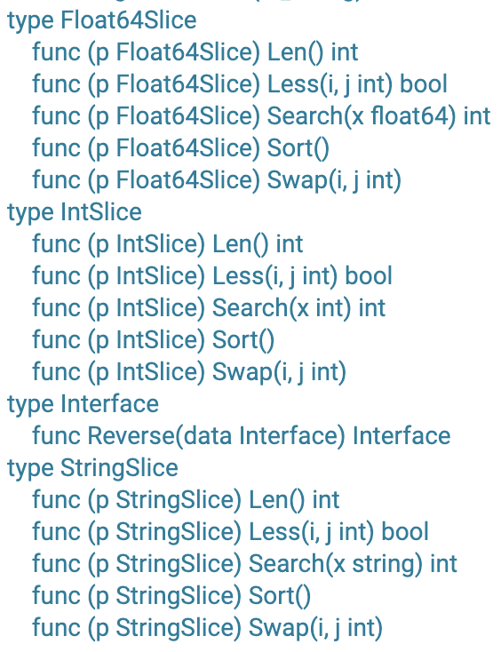 sort package를 사용해서 sort를 하면 nlogn 시간을 보장한다고 한다. 그리고 이것을 사용 하려면 기본적으로 어떤 타입에 대한 Len(), Swap(), Less()함수를 구현해야한다. 하지만 이미 구현되어 있는 것도 있다. 위의 sort doc 사이트에 들어가보면